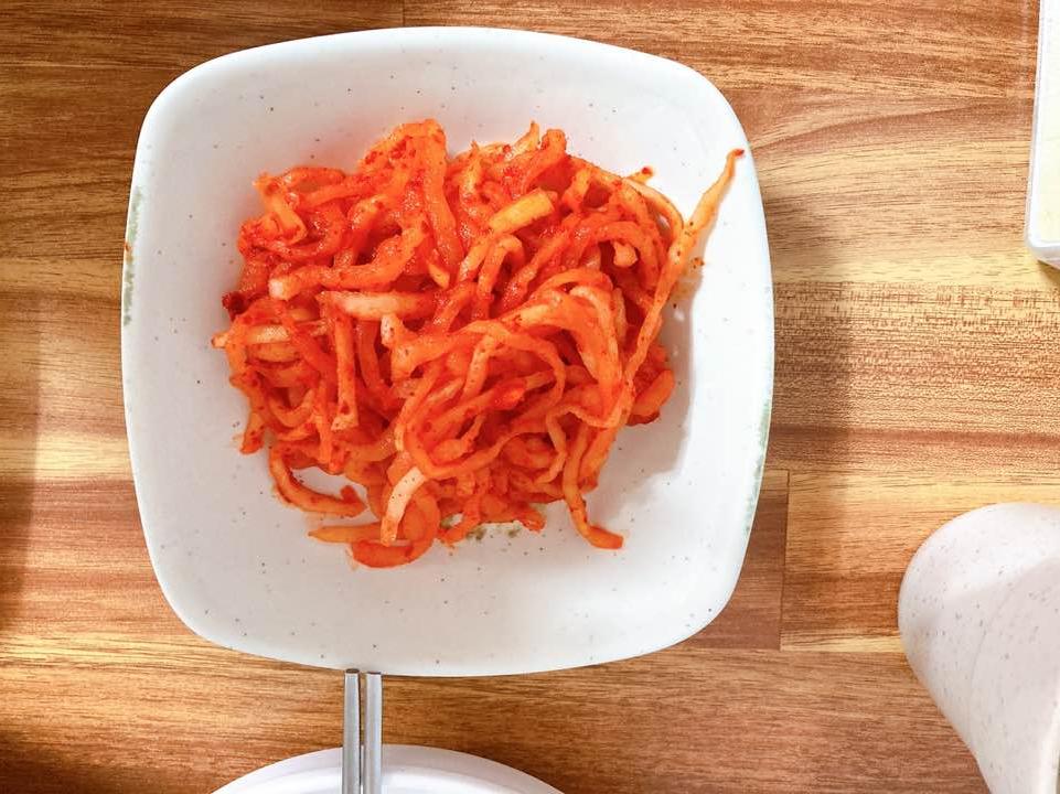 기본 반찬으로 나오는 무생채와 김치입니다.