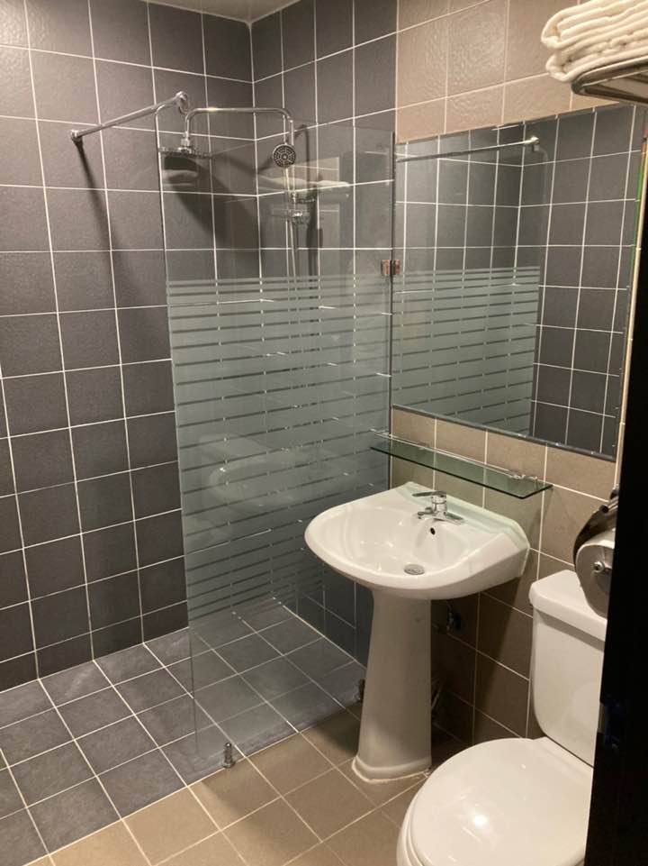 화장실도 ... 음... 나쁘지 않아요. 어두운 그레이 칼라의 타일로 적당히 무거운 분위기를 보이고 있었어요.
