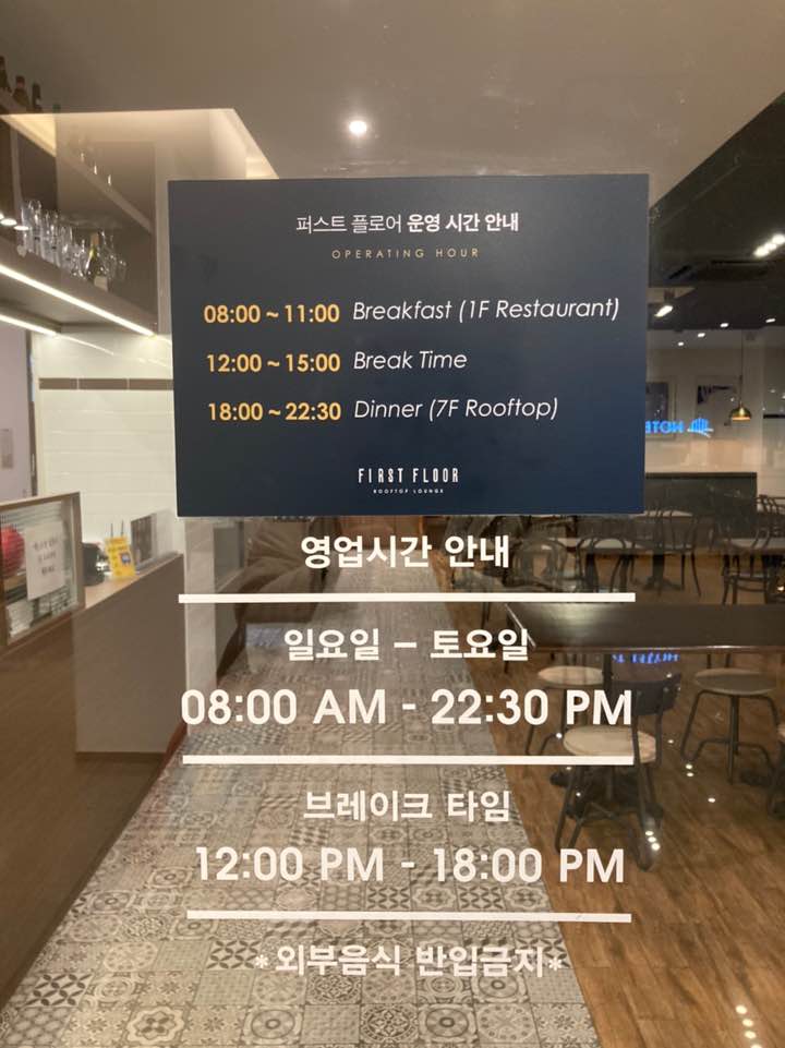 낮에는 1층 레스토랑에서 커피나 간단한 음식을 이용하실수 있고 저녁에는 7층 루프탑에서 술을 즐기실 수 있어요.
