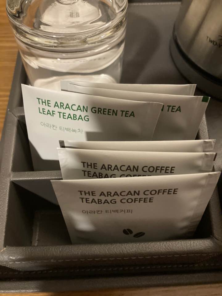 녹차 티백 3개와 커피 티백 3개도 있어요. 맛은 보지 않았습니다..